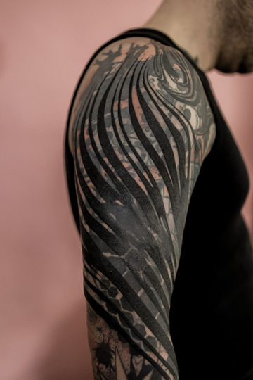 Ein altes Tattoo geschickt mit einer schwarzen Fläche zu überdecken, sodass es im neues Motiv verschwindet, funktioniert besonders bei kleinen Motiven sehr gut. Größere Bereiche erfordern dagegen schon etwas radikalere Maßnahmen. Blackout-Tattoo: Das großflächige Ausschwärzen von Hautbereichen oder ganzen Körperteilen sind Beispiel für eine relativ kompromisslose und pure Ästhetik im Bereich der Cover-Up-Tattoos. Blast-Over verzichten dagegen auf den Anspruch, das alte Tattoo vollständig zu überdecken. Sie bilden viel mehr eine zweite Ebene. Das über die Zeit verblasste Farb-Tattoo tritt in den Hintergrund und erwacht in Kombination mit dem massiveren, schwarzen Blast-over zu neuem Leben.